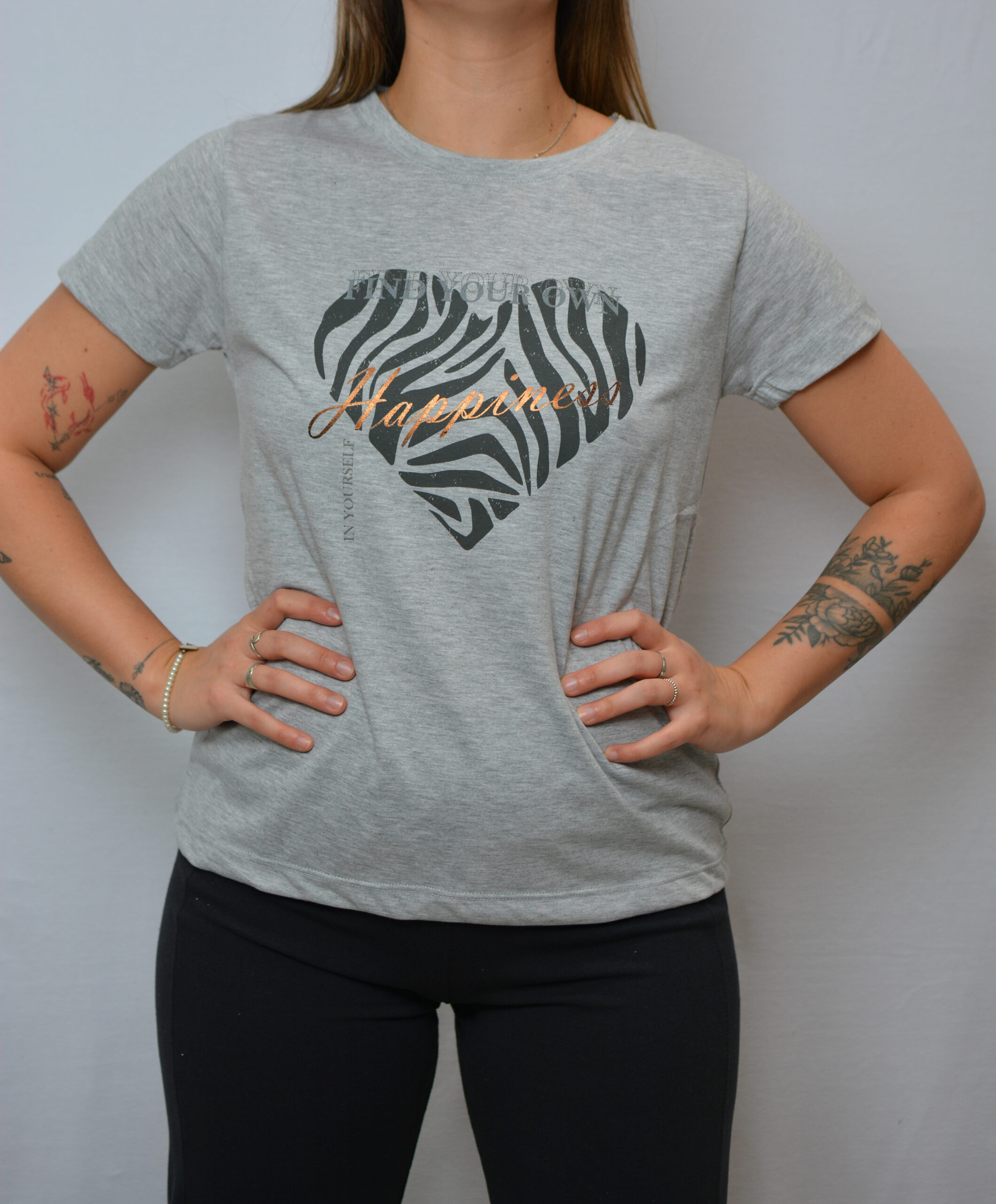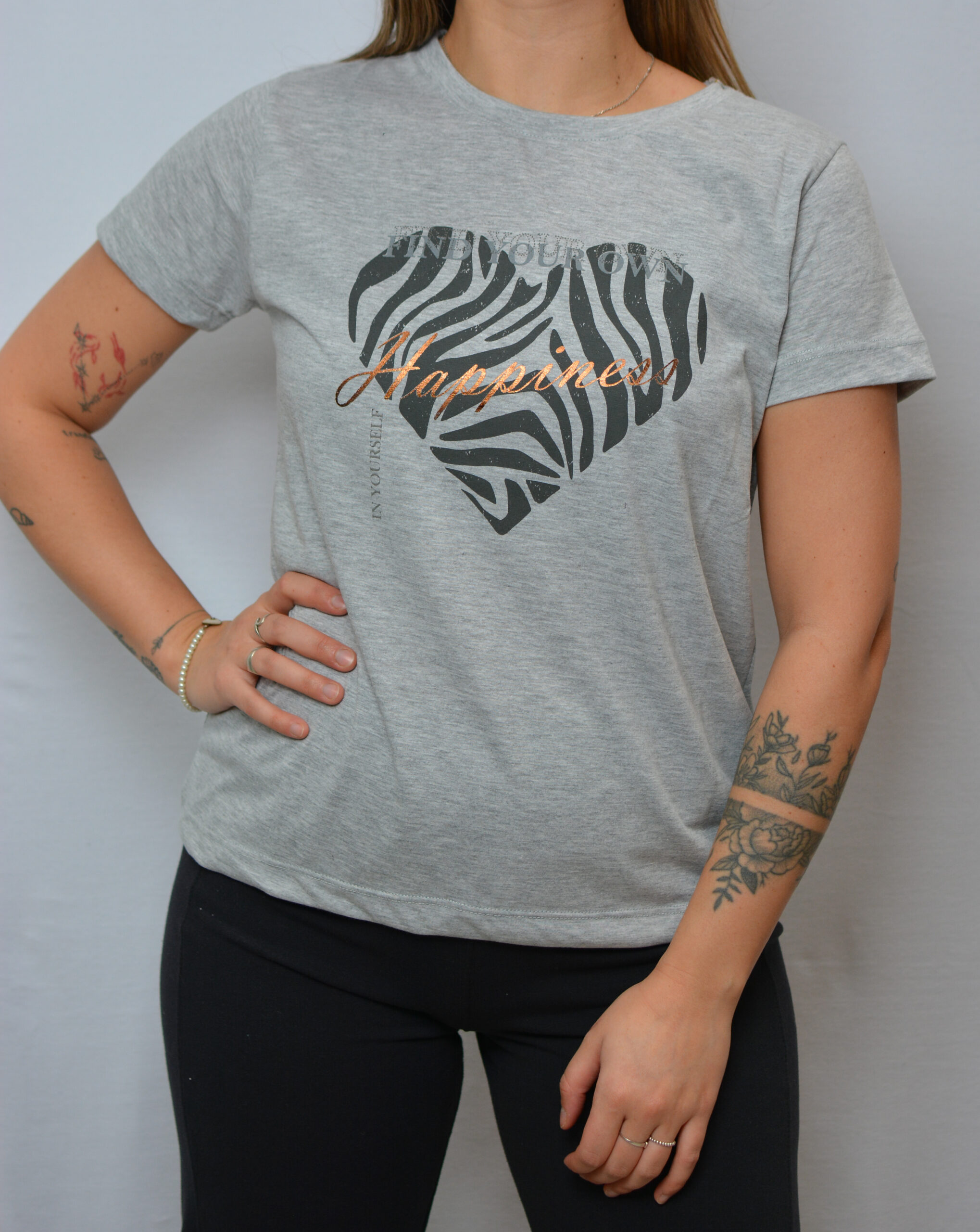 La remera HAPINESS con tela jersey melange es una declaración de comodidad y estilo. Sentite bien en cada detalle.